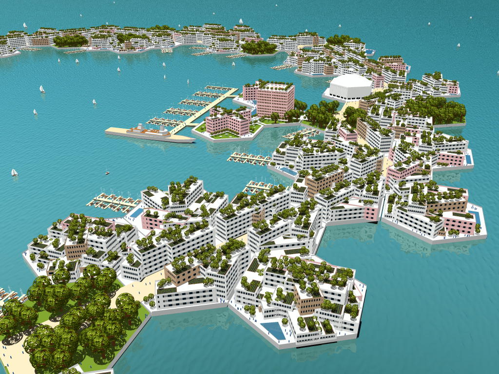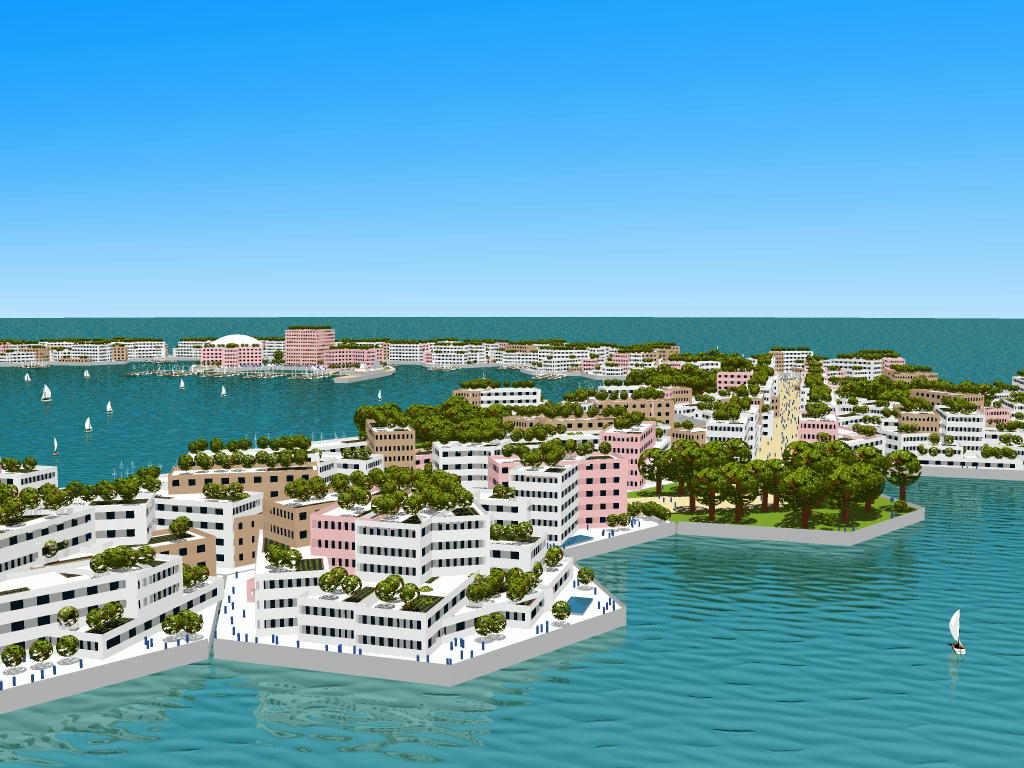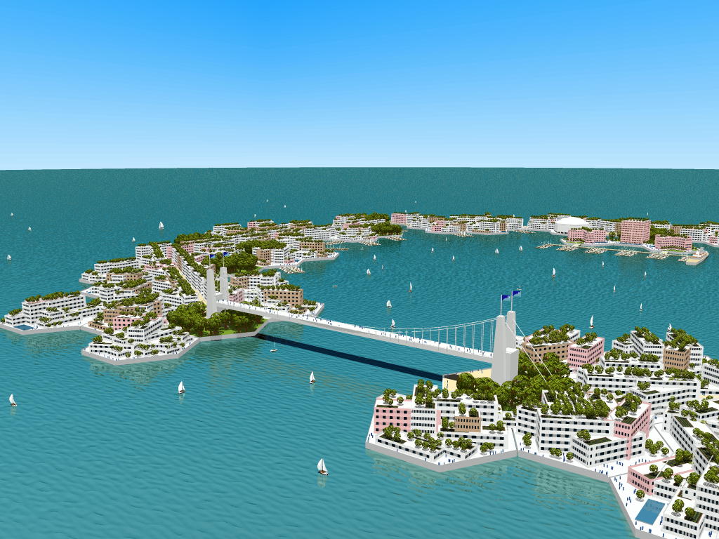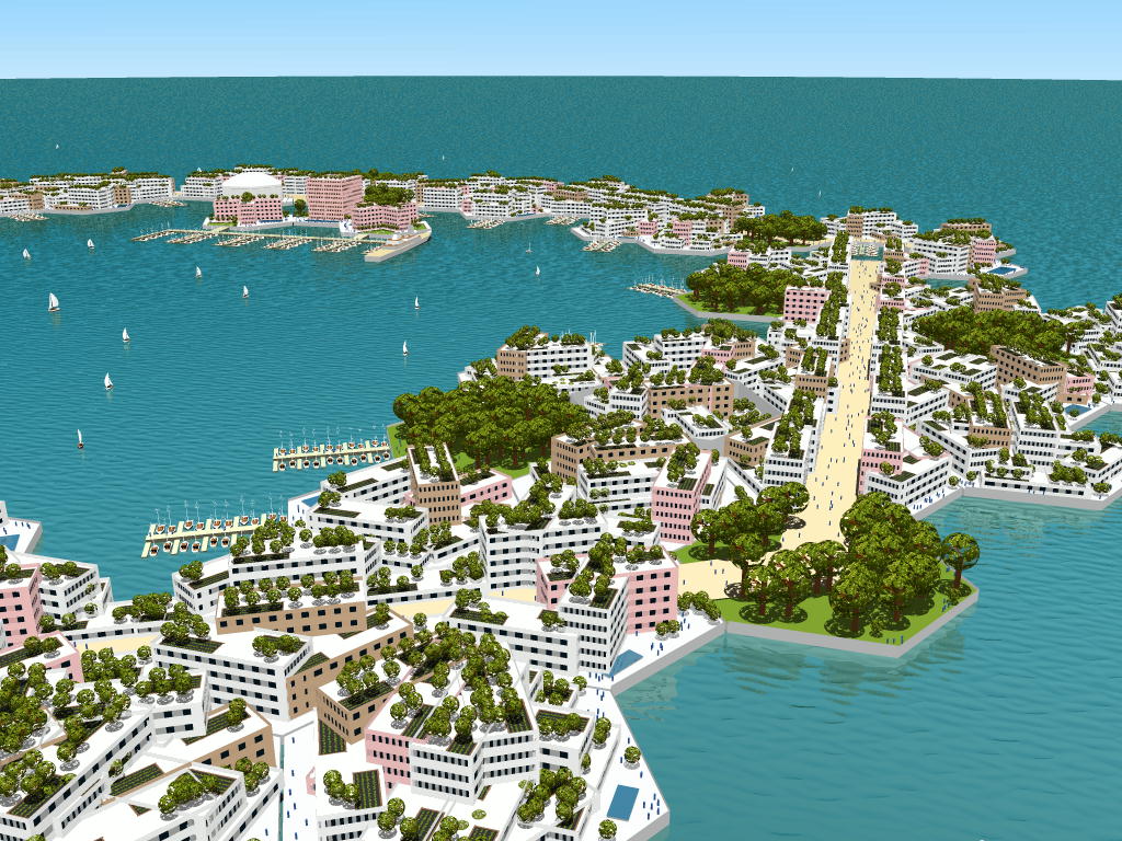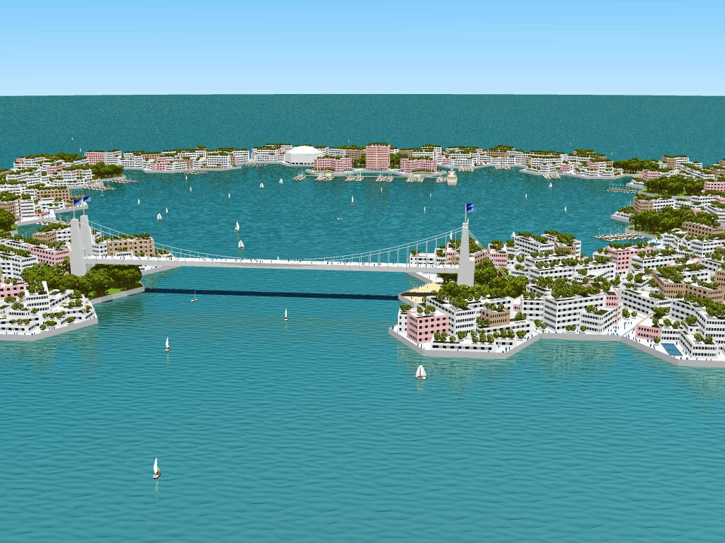 Images of our new country were created by architect Jim Albea who is also the inventor of the two-player abstract strategy board game Plateau. Jim created these images for the Atlantis Project using Intergraph Corporation’s ModelView program to render a MicroStation 3D model. There are ten images, each of which is a different view of a computer generated model of Oceania as it might appear from an approaching helicopter or ship.