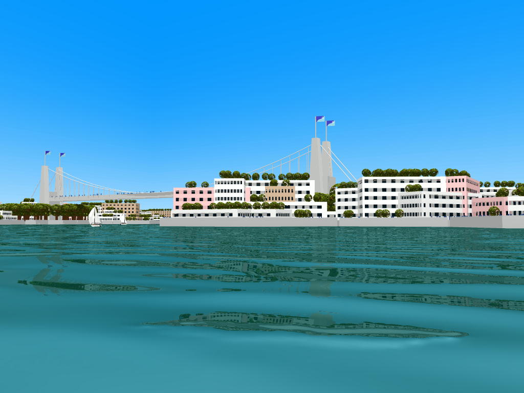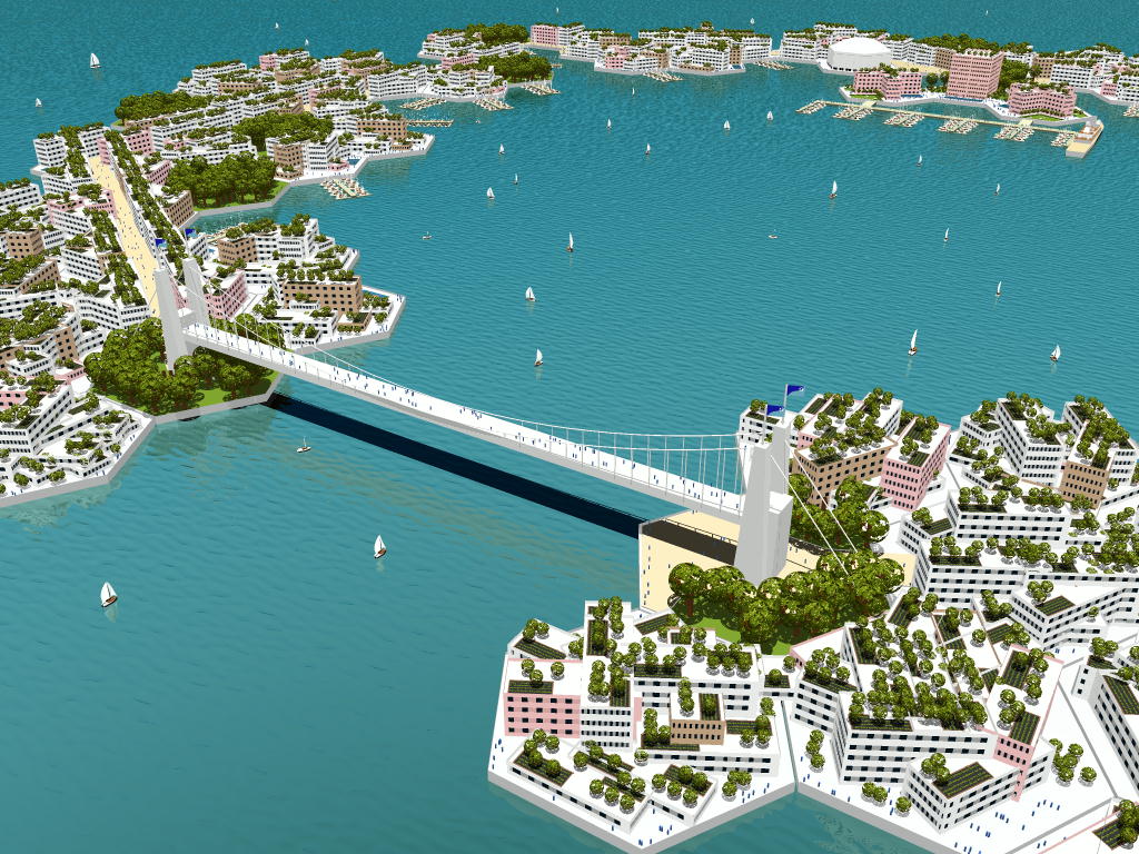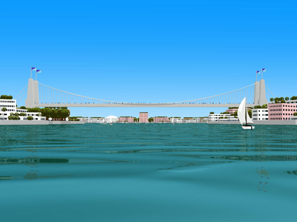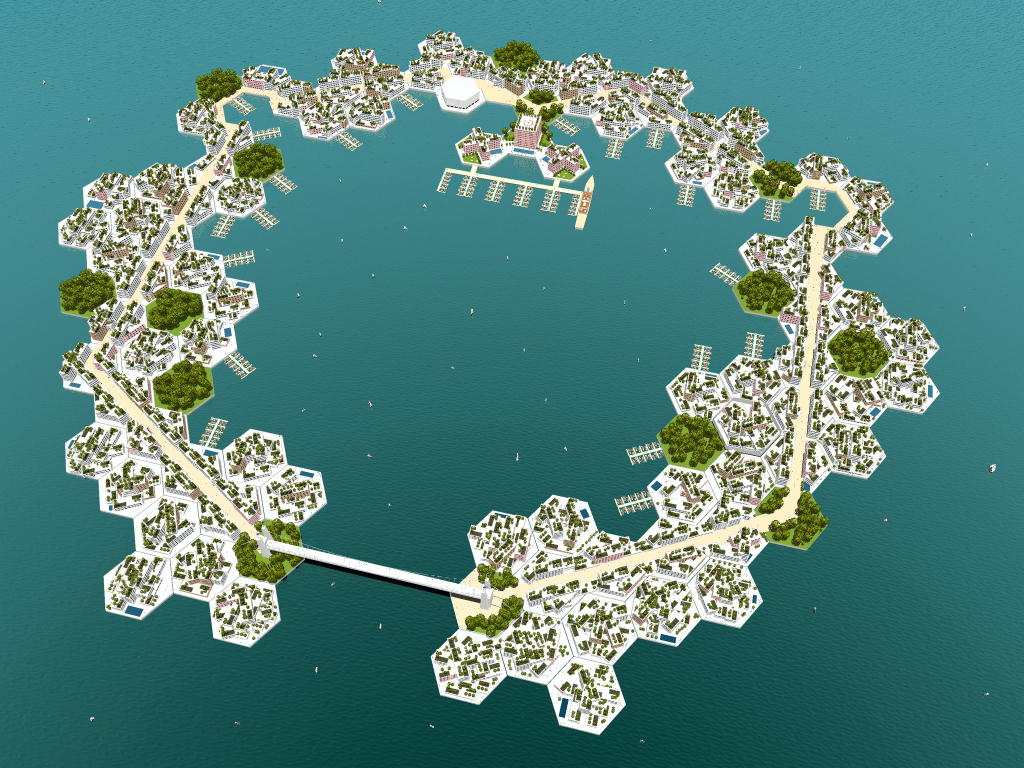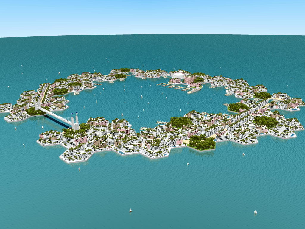 Images of our new country were created by architect Jim Albea who is also the inventor of the two-player abstract strategy board game Plateau. Jim created these images for the Atlantis Project using Intergraph Corporation’s ModelView program to render a MicroStation 3D model. There are ten images, each of which is a different view of a computer generated model of Oceania as it might appear from an approaching helicopter or ship.